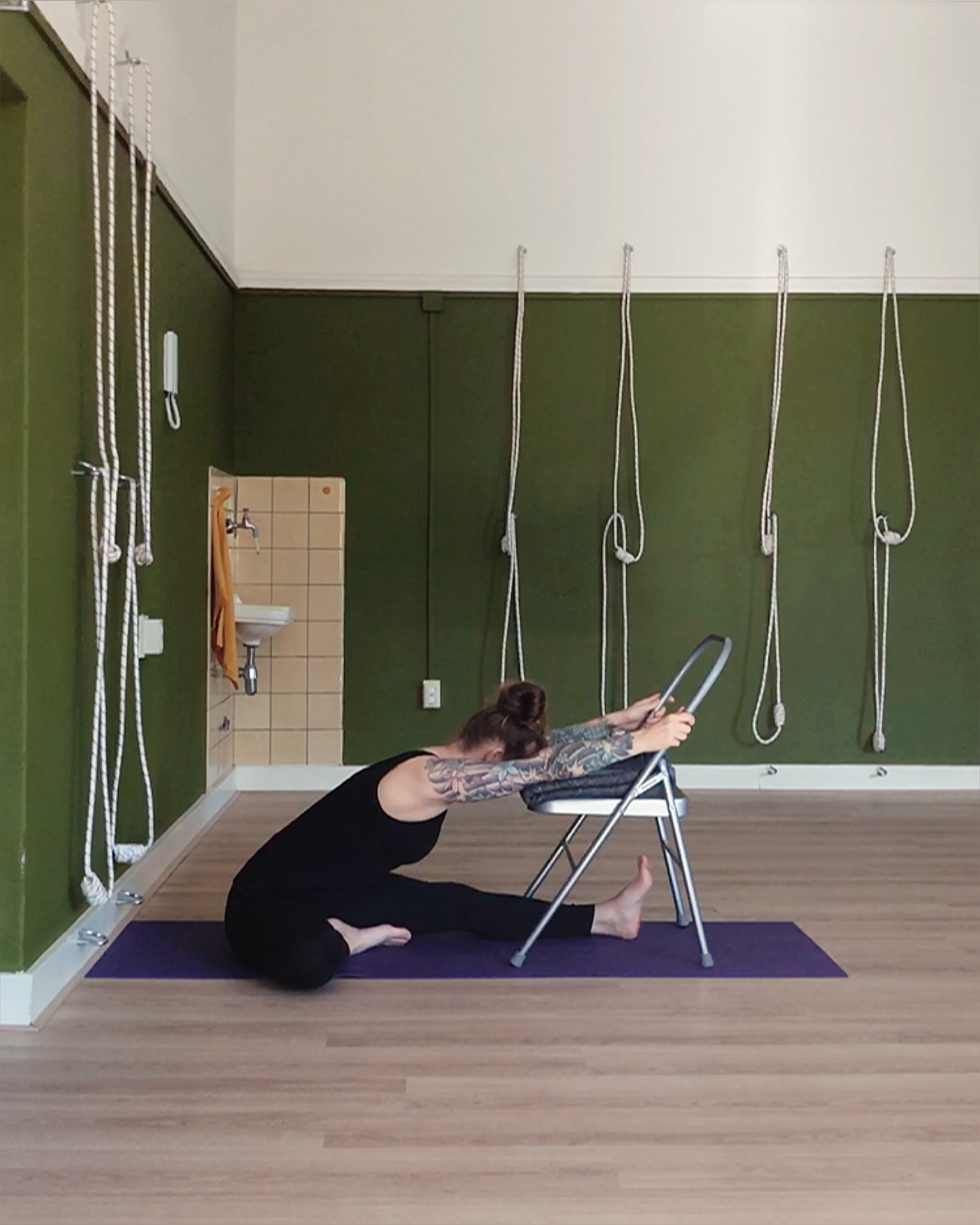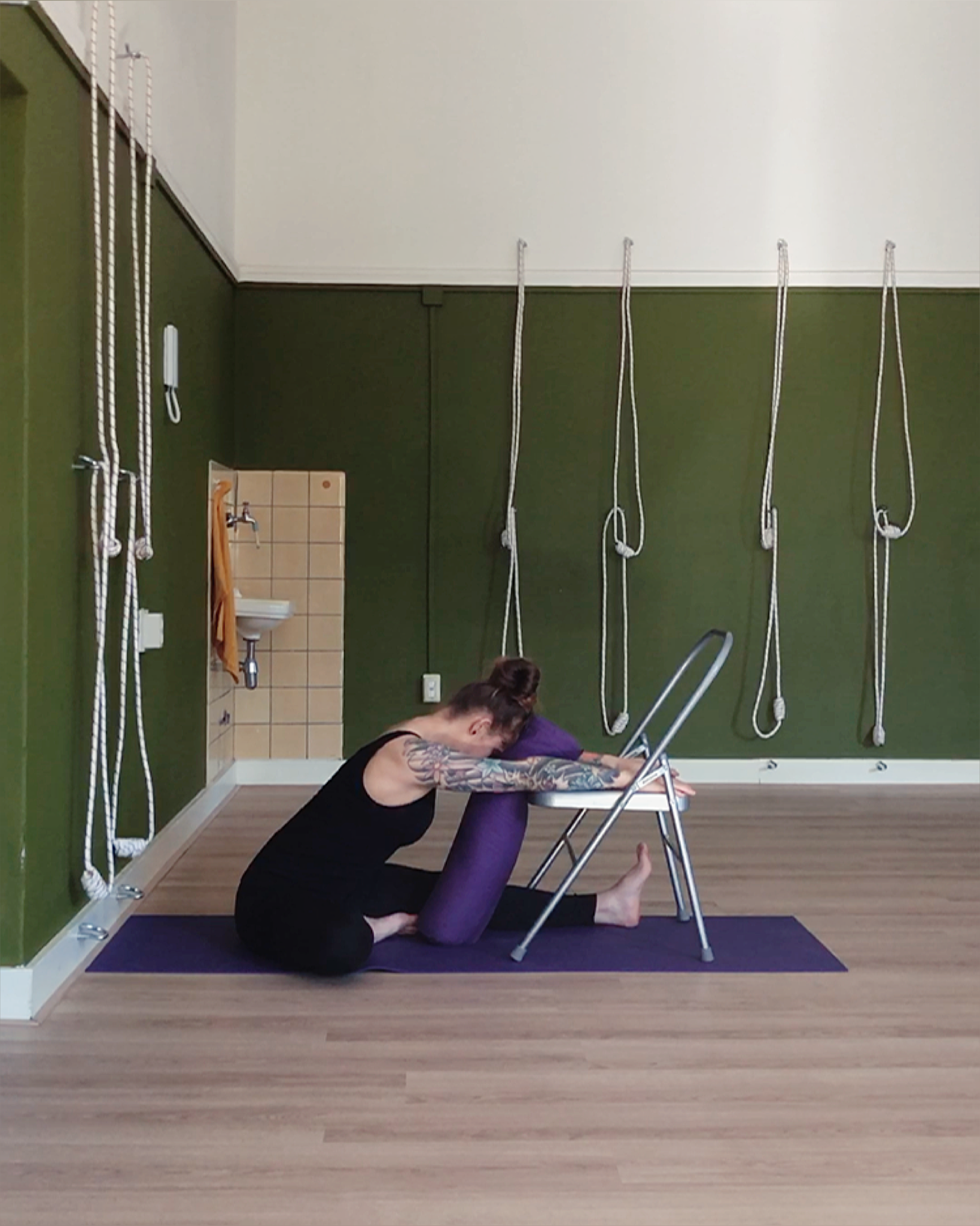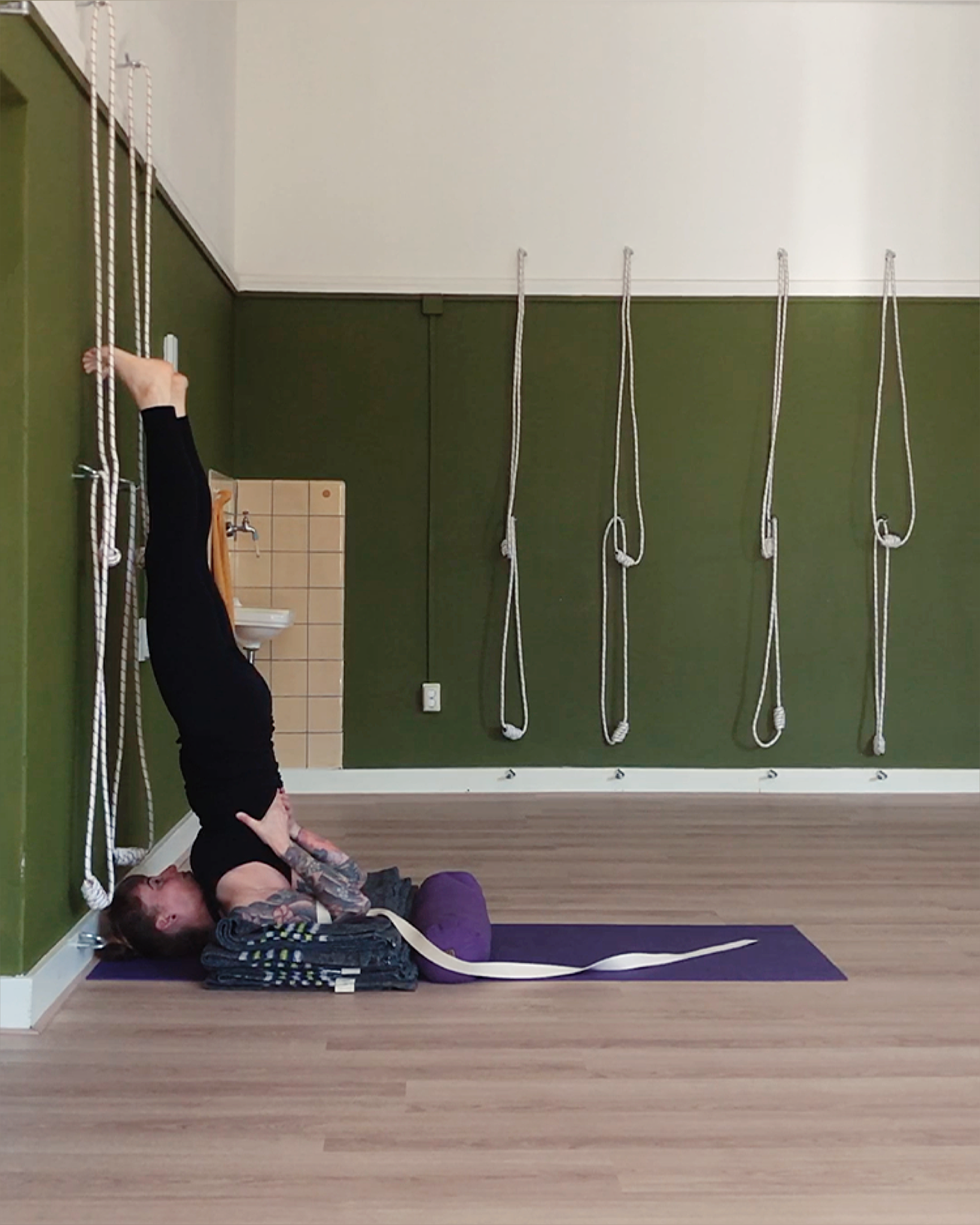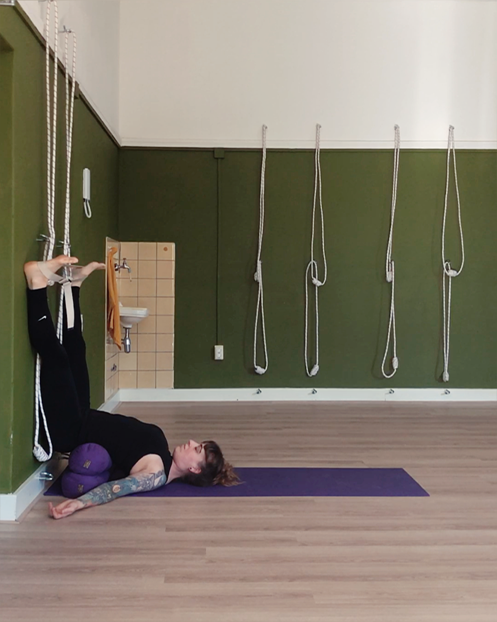 De yogahoudingen zijn met behulp van hulpmiddelen.