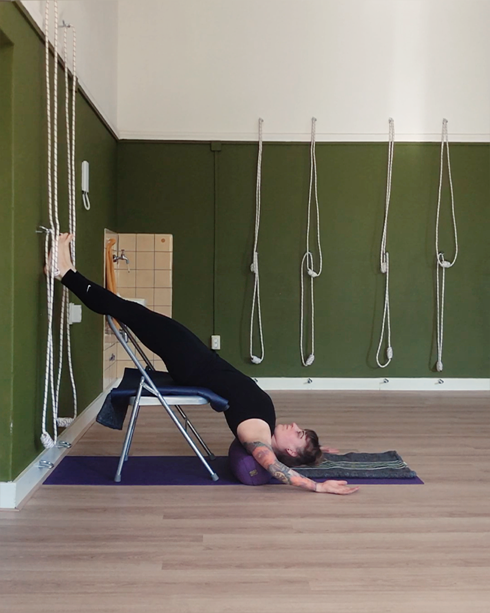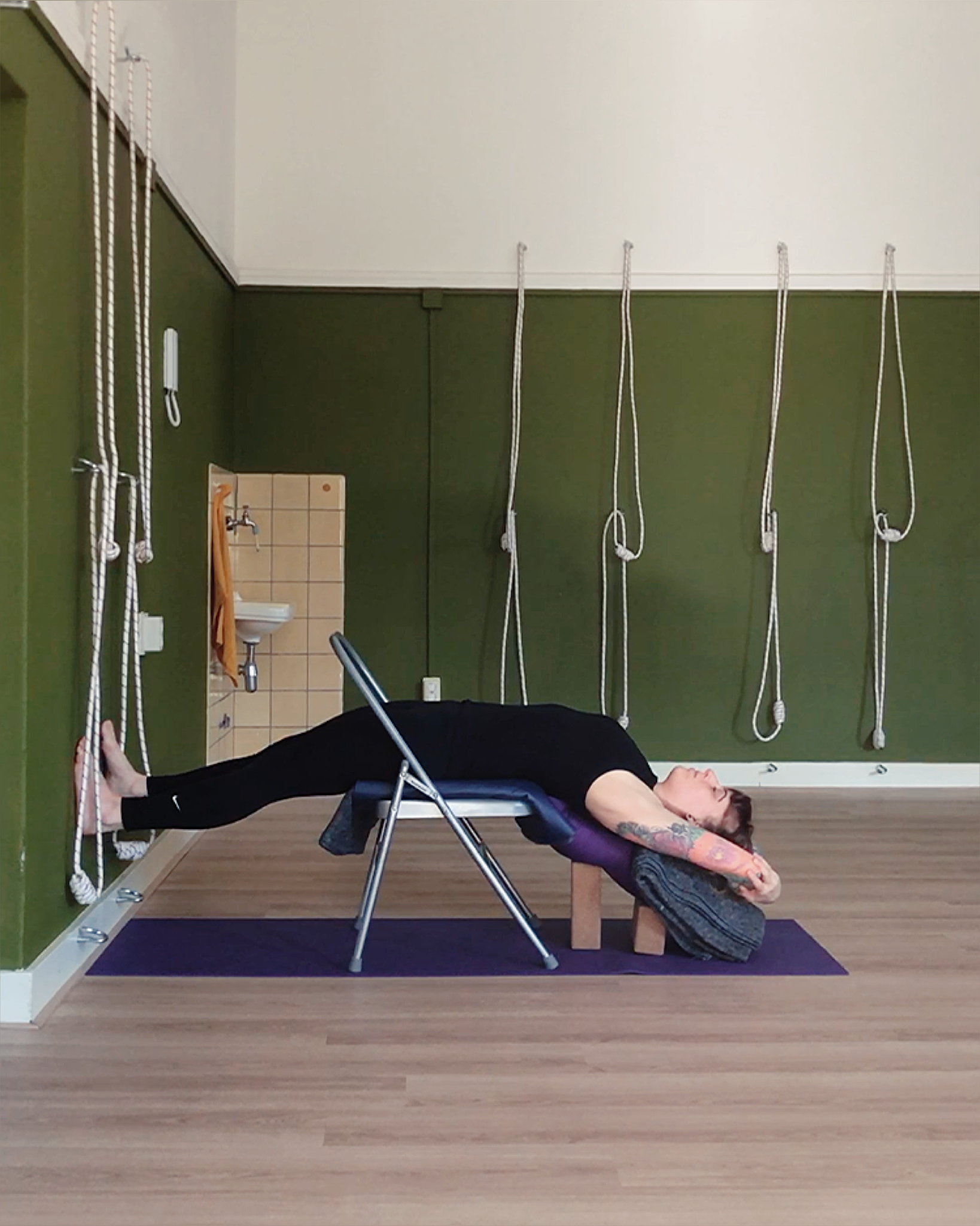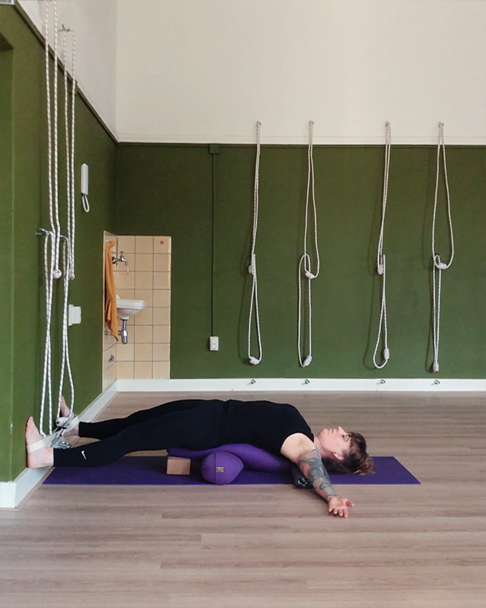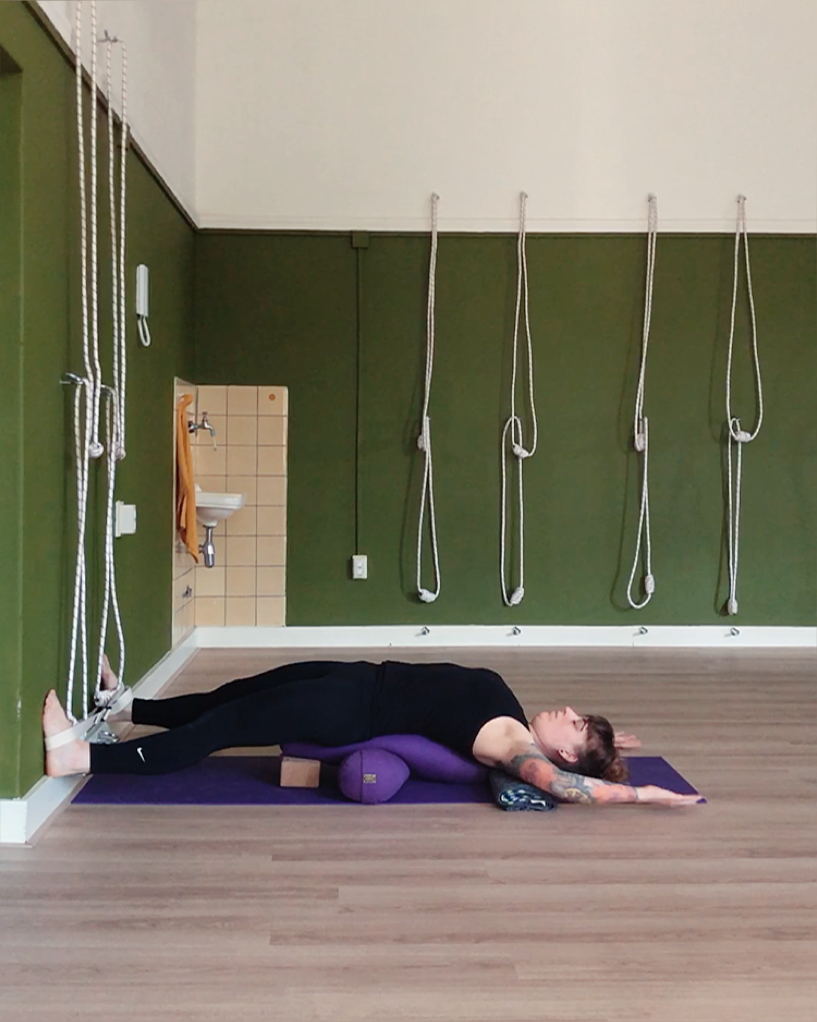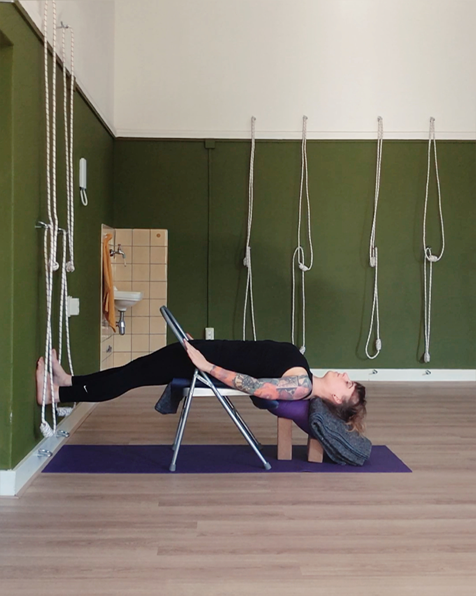 De yogahoudingen zijn met behulp van hulpmiddelen.