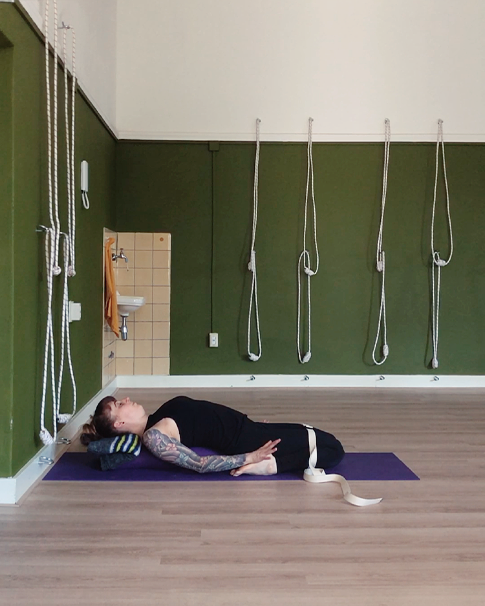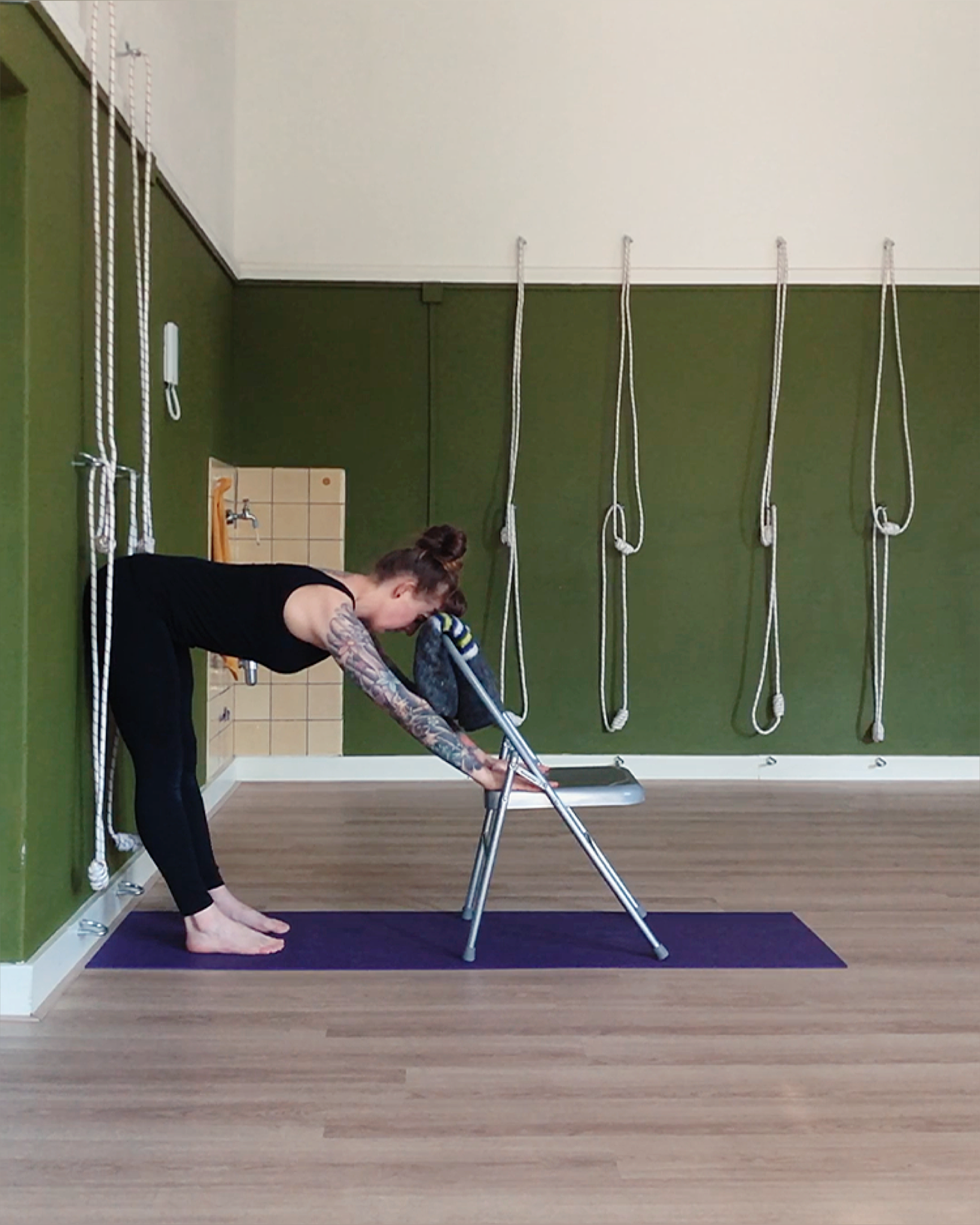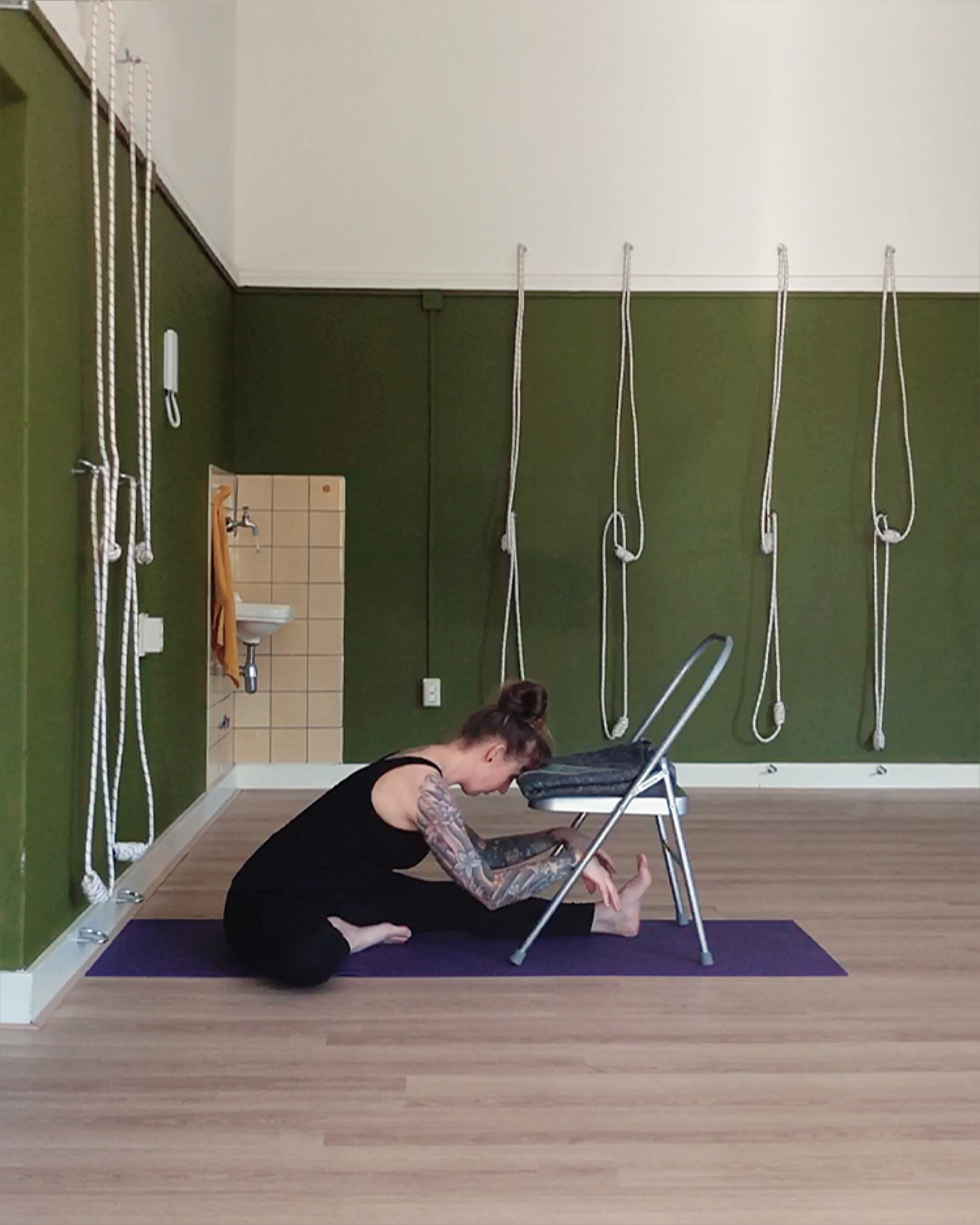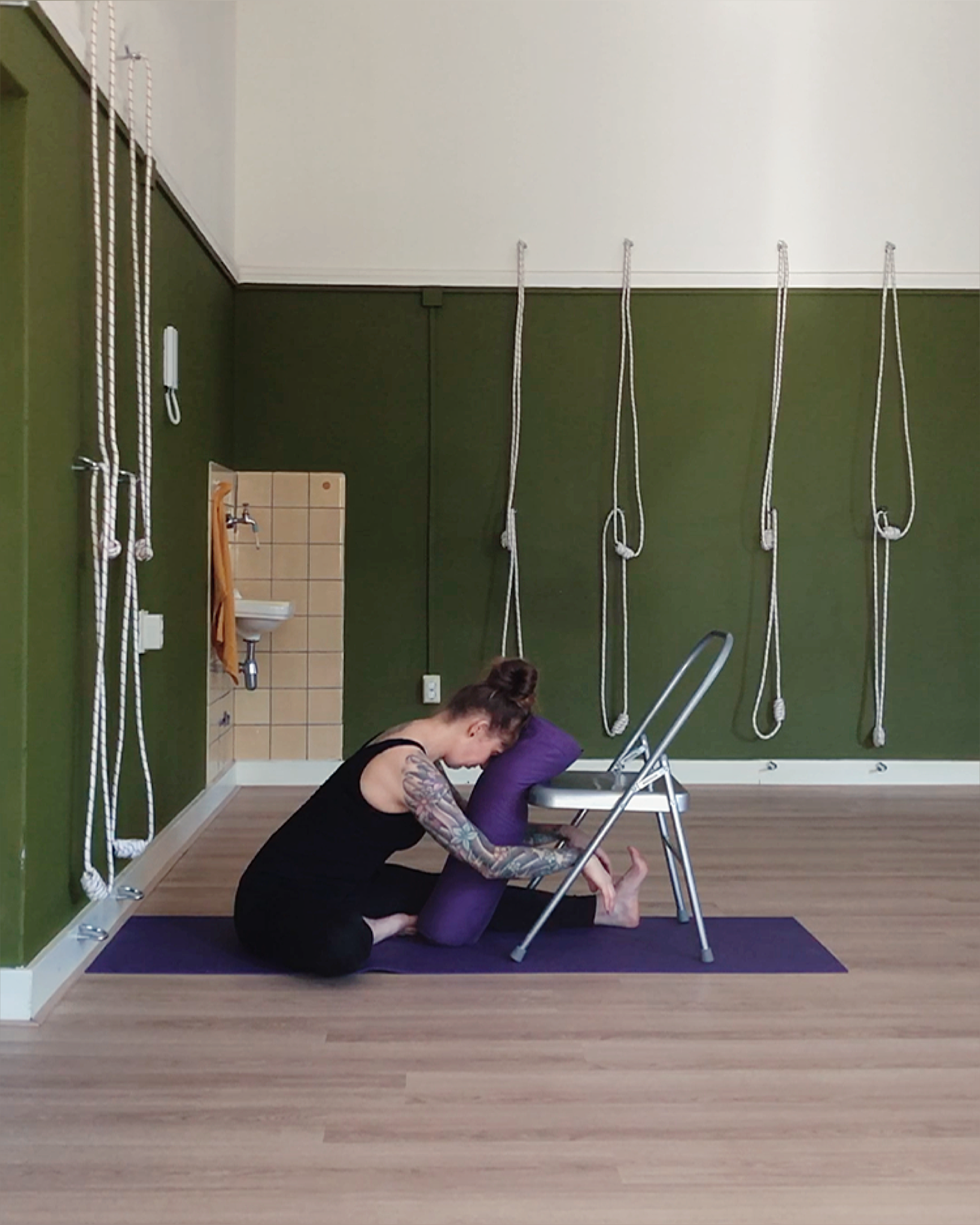 De yogahoudingen zijn met behulp van hulpmiddelen.
